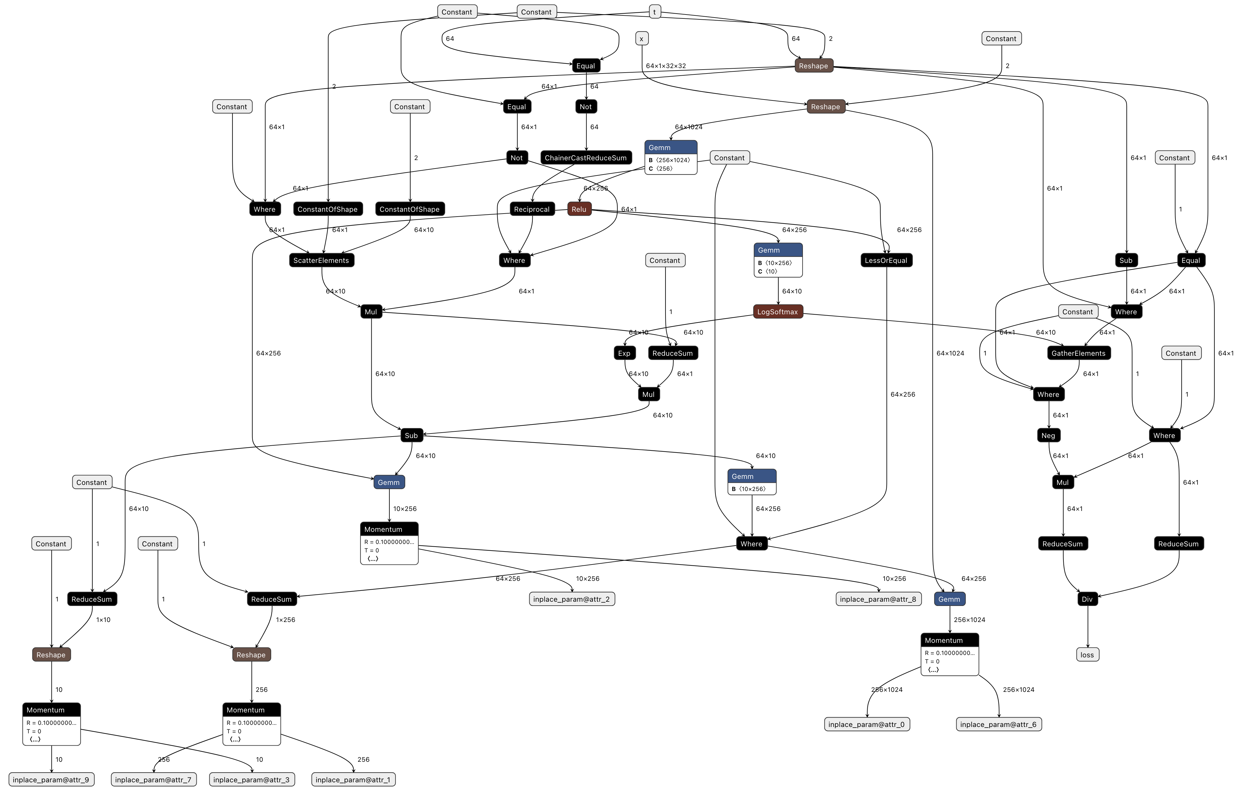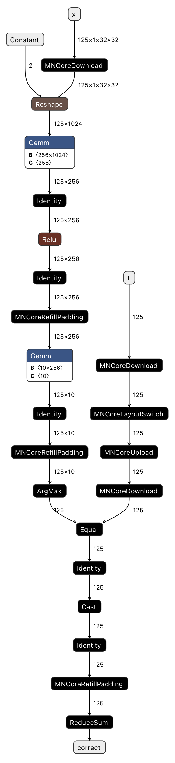 Constant() -> (val_1_fx2onnx): Creates a constant tensor to be input to theReshapeoperator. SinceConstanthas no dependencies, it is typically scheduled first.MNCoreDownload(t) -> (t_Download_1): Moves input tensortfrom DRAM to LMMNCoreLayoutSwitch(t_Download_1) -> (t_LayoutSwitch_0): Changes the layout of tensortMNCoreUpload(t_LayoutSwitch_0) -> (t_LayoutSwitch_0_Upload_0): Moves the reformatted tensortback to DRAMMNCoreDownload(x) -> (x_Download_0): Moves input tensorxfrom DRAM to LMReshape(x_Download_0, val_1_fx2onnx) -> (view_fx2onnx): Reshapes tensorxGemm(view_fx2onnx, attr_0, attr_1, transB) -> (addmm_fx2onnx): Performs matrix multiplication using the newly reshaped tensorxas input