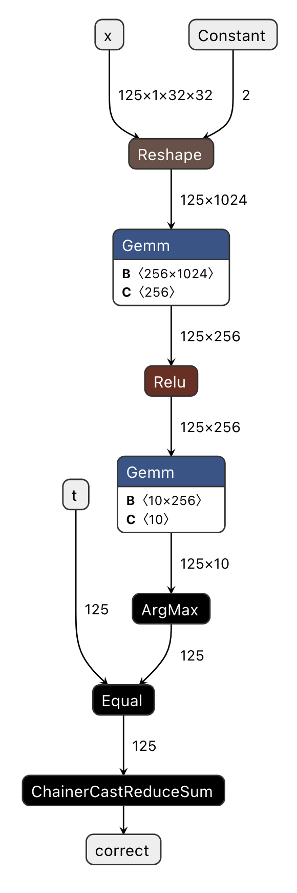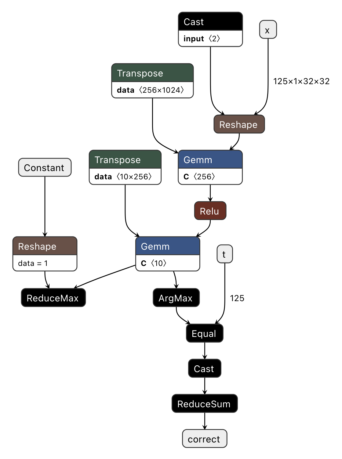 This visualization clearly shows that eval_step’s input/output variables (x, t, correct) correspond to the ONNX’s input/output parameters. Additionally, we observe that the output of Transpose serves as the right input for Gemm, while the unused branch of torch.max (ReduceMax) remains intact.